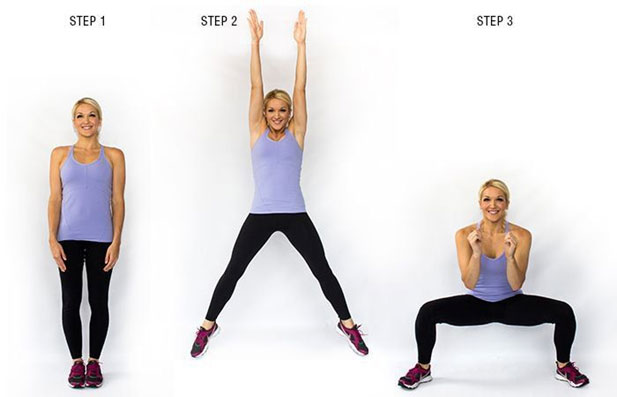 Start with feet wide apart and hand at side, then together jump your legs out and raise arms above your head then reverse it keep doing this.