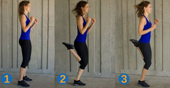 Jump fast on the spot from one foot to the other, lifting your knees as high as possible, don’t land too hard on your foot land softly.