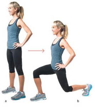 Stand with your feet shoulder-width apart, Step back with your right foot bending both knees to form a 90 degree to a lunge position. Keep your back straight then return to starting position repeat the exercise with other leg in front.