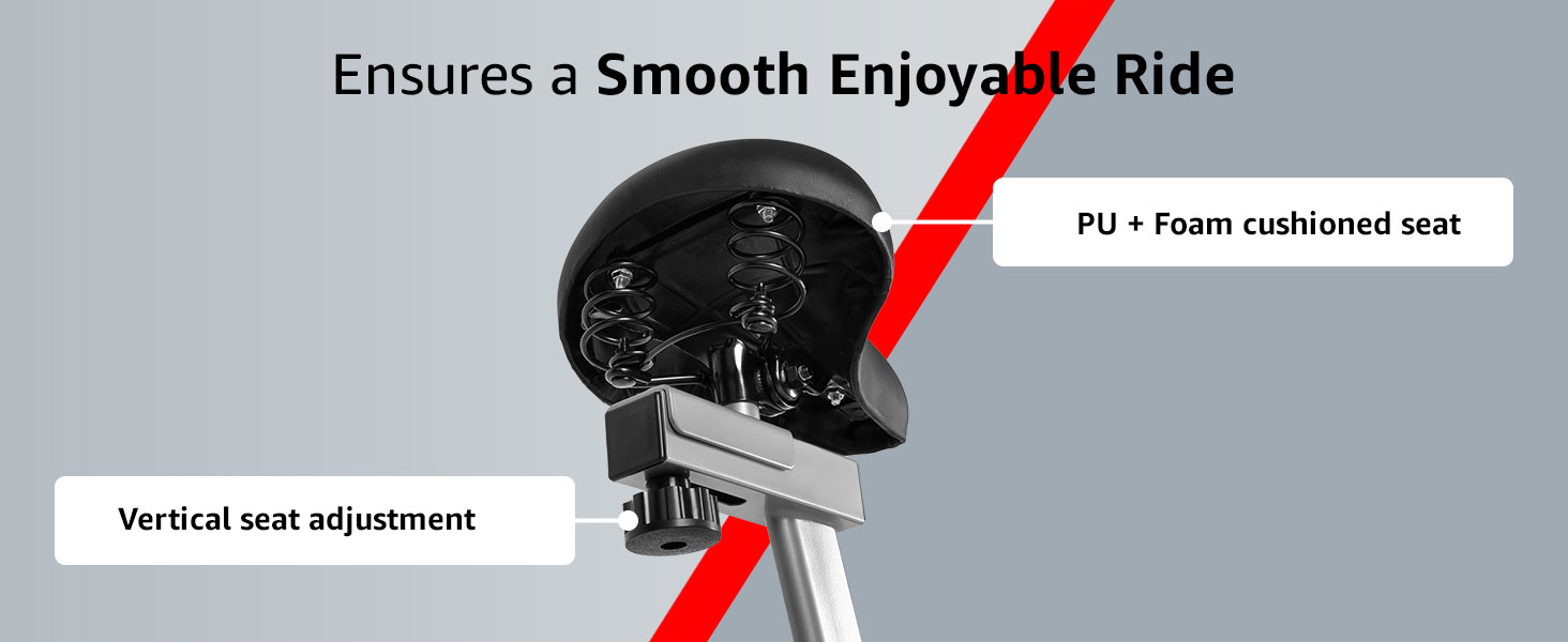 Enjoy superior comfort with the vertically adjustable PU + foam seat, designed for optimal posture support. The steel handlebar with a foam grip ensures a firm yet comfortable hold, allowing you to ride for longer durations without discomfort.
