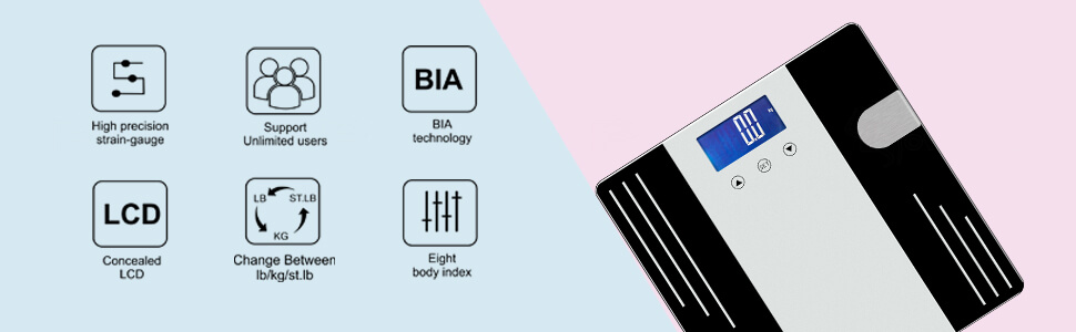 BCA-07 measures your body weight, Body fat, Body hydration, Body muscle, Body bone, Calories indication, BMI Indication (Somatotype judgment)