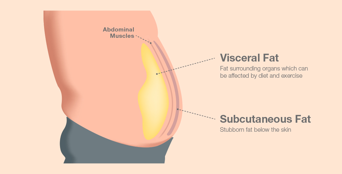 Visceral Fat- Visceral fat is an intra-abdominal fat, which is stored around and between your organs in your abdomen. Even if your weight and body fat remains constant, as you get older the distribution of fat changes and is more likely to shift to the abdominal area. Ensuring you have a healthy level of visceral fat directly reduces the risk of certain diseases such as heart disease, high blood pressure and diabetes.