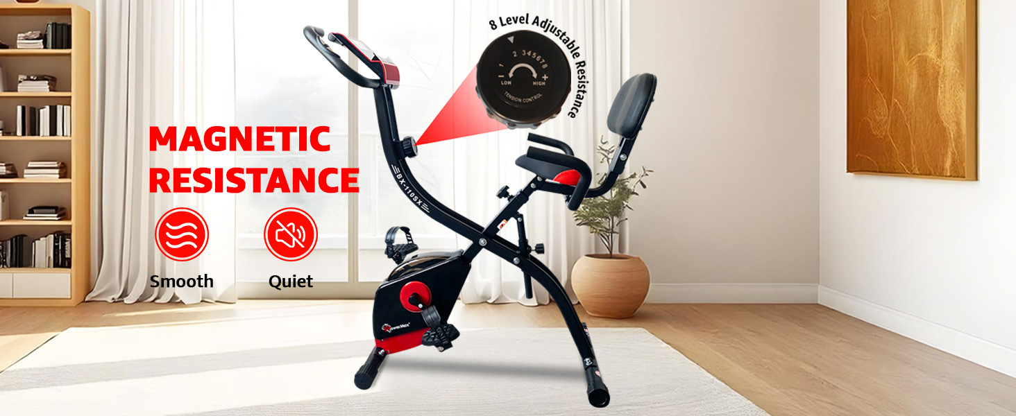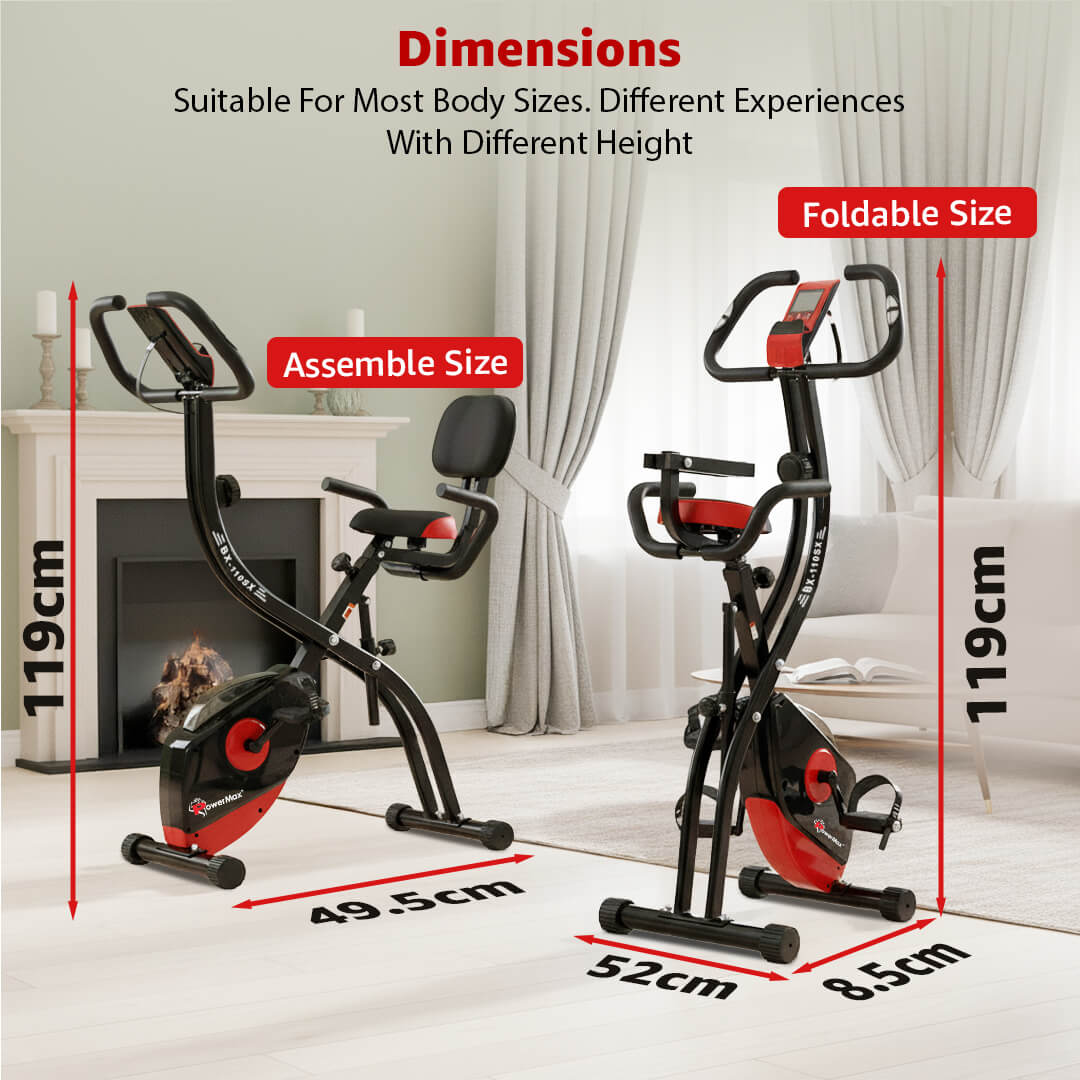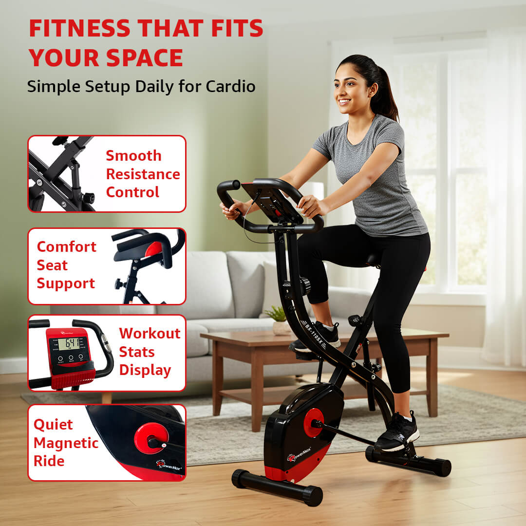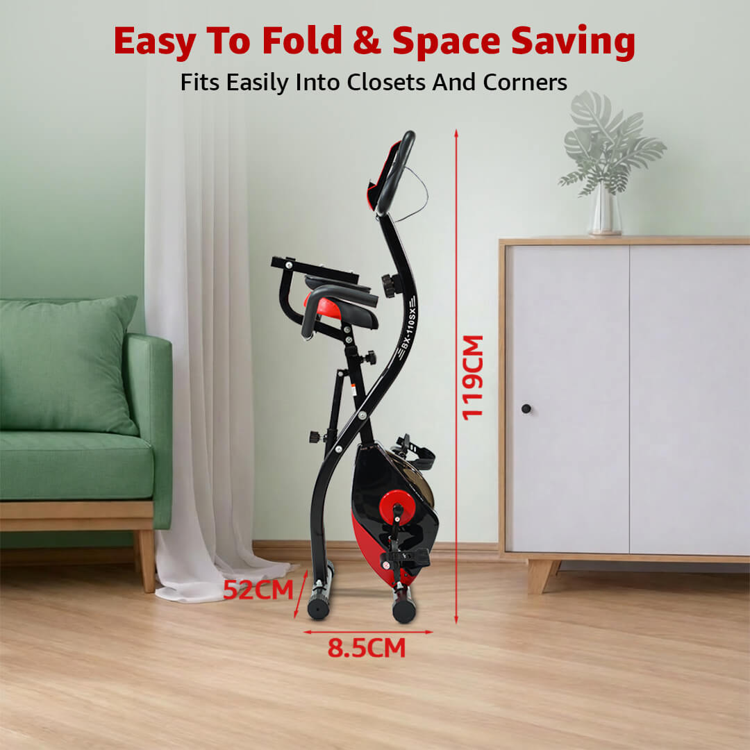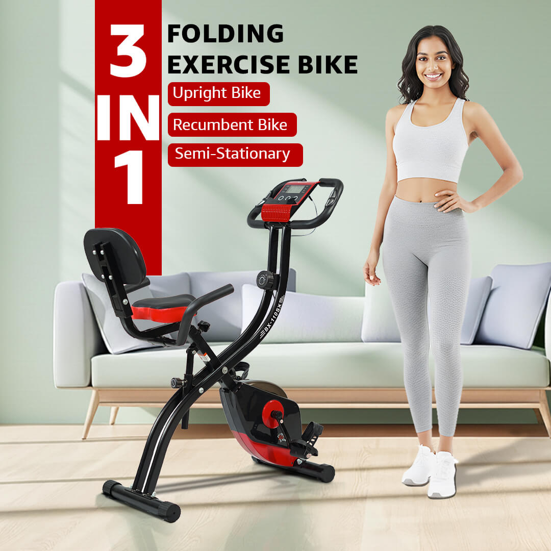- It has an incredible benefit: it is a foldable upright bike for easy storage. When used as a recumbent bike with a steel flywheel, it provides the same smoothness as an indoor cycle. Adjustable resistance levels of intensity with 8 preset magnetic manual tension knob levels Adjustable seat for personalized riding