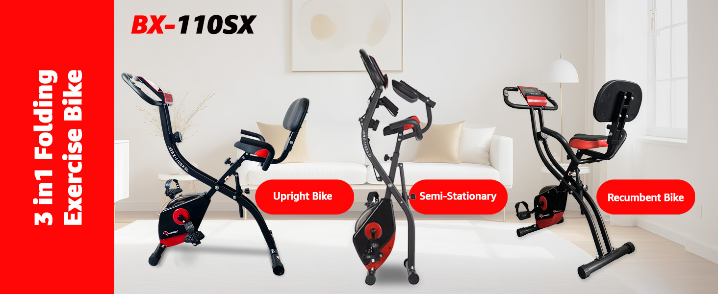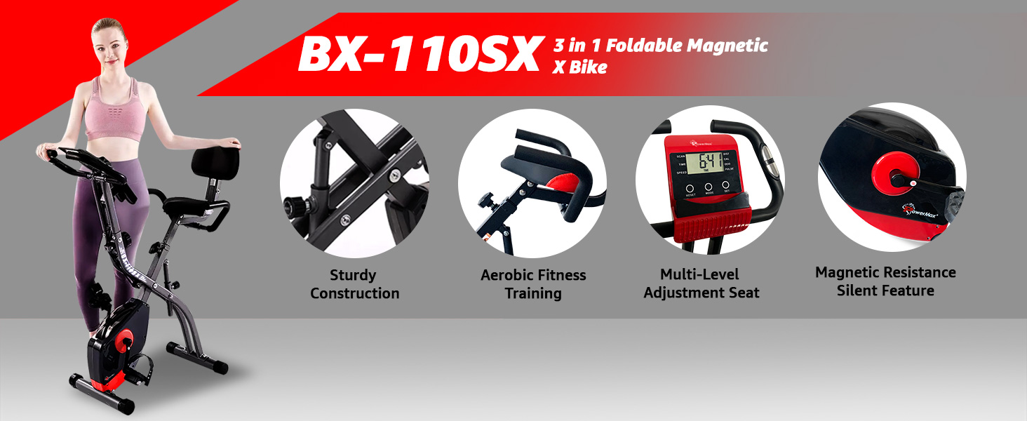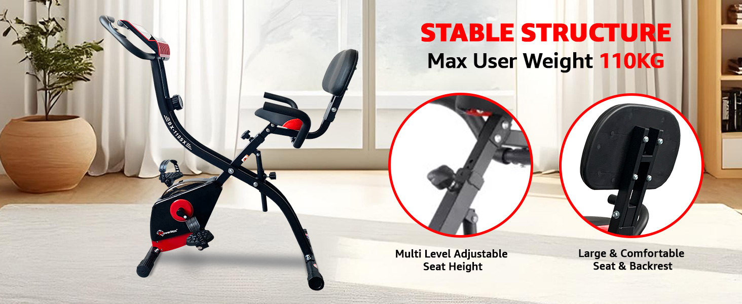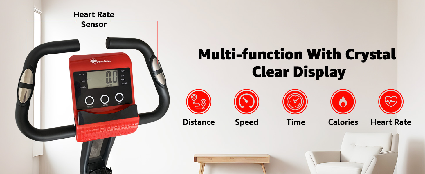 Experience the versatility and space-saving design of the PowerMax BX-110SX 3-in-1 Foldable Magnetic Upright Bike with Back Rest. With customizable resistance levels, real-time performance tracking, and a reliable 4 kg flywheel, this bike ensures an effective and enjoyable workout. The ergonomic seating and handlebars provide exceptional comfort, while the easy assembly and additional features like an iPad holder and adjustable stabilizers enhance your fitness journey.