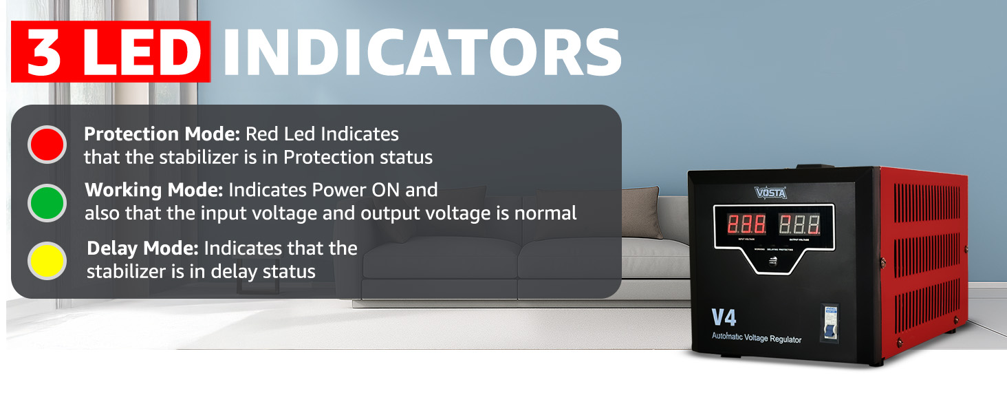 The Vosta V4 features a bright digital LED display that continuously monitors and displays the input and output voltage. With three intuitive LED indicators, it provides real-time voltage updates for enhanced convenience and peace of mind.