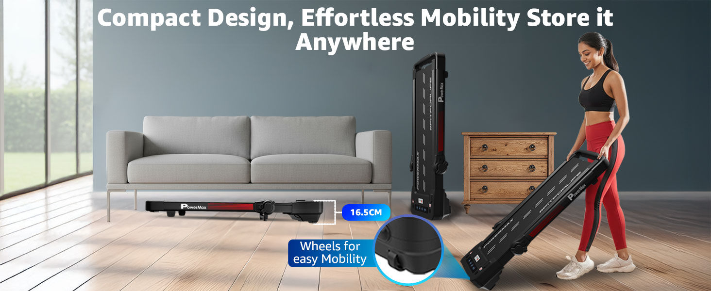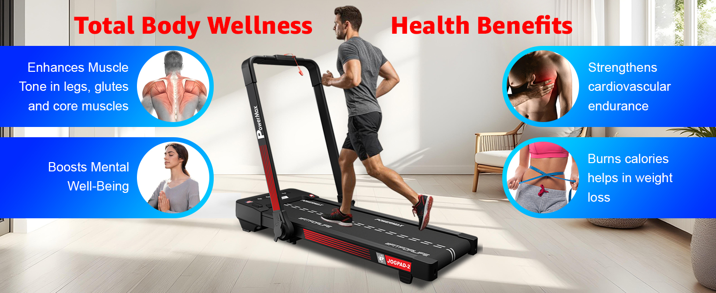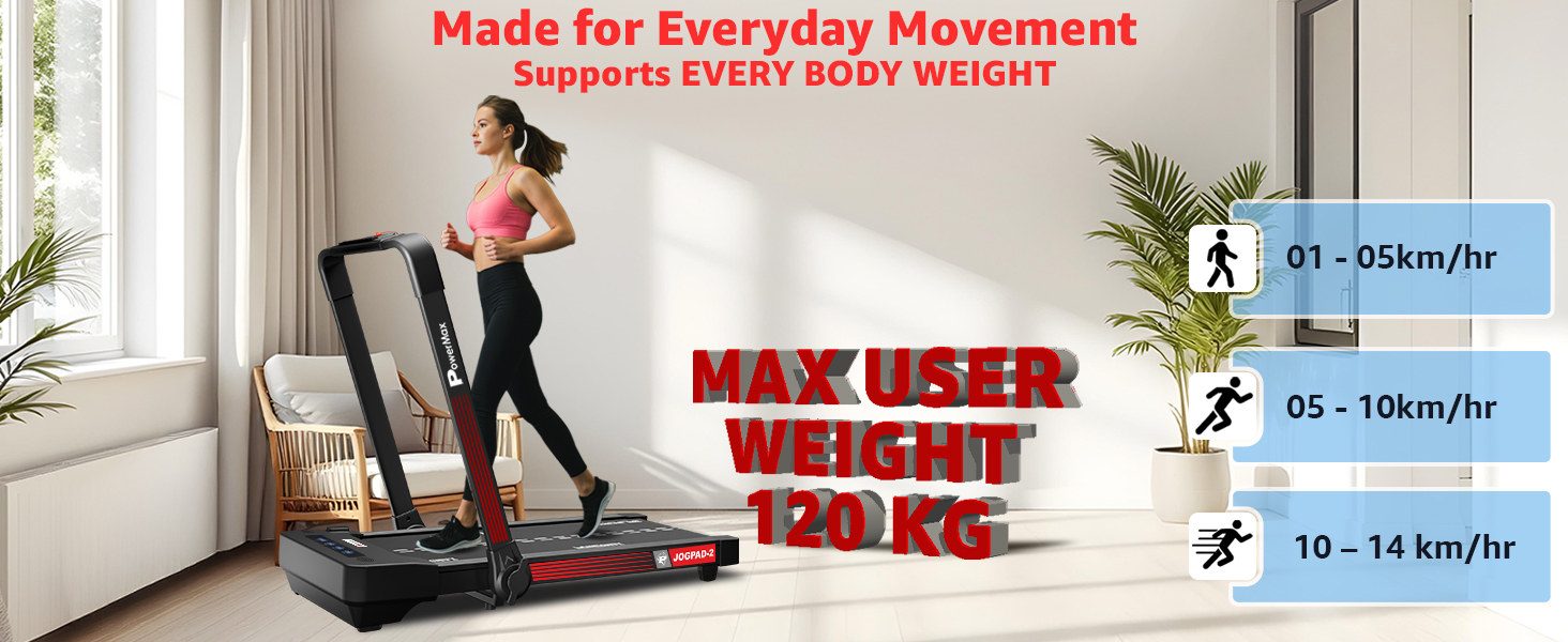 A choice aligned with you. With a maximum user weight capacity of 120kg, the JogPad-2 motorized treadmill accommodates various users. For enhanced longevity and performance, Powermax recommends factoring in an additional 25 kg buffer for running. For example, if your weight is 95 kg or less, a 120 KG max capacity treadmill is suitable.