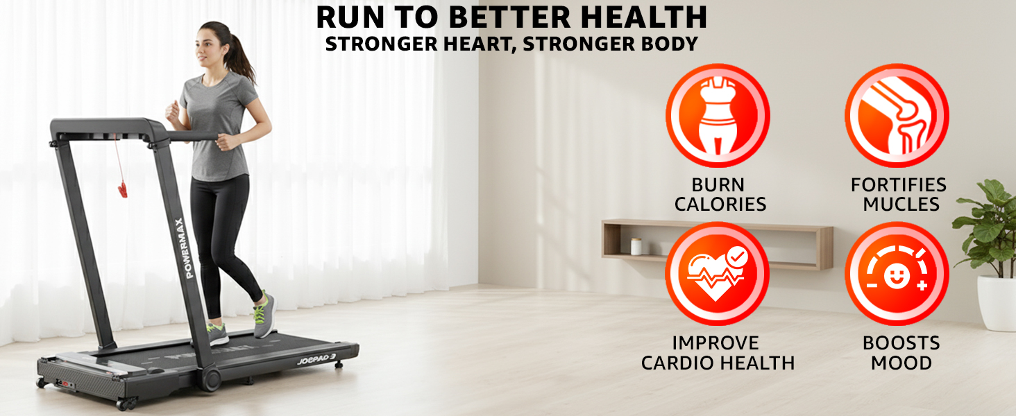 A choice aligned with you. With a maximum user weight capacity of 110 KG, the JogPad-3 motorized treadmill for home use accommodates various users. For enhanced longevity and performance, Powermax recommends factoring in an additional 25 KG buffer for running. For example, if your weight is 85 KG or less, this treadmill with a 110 KG max capacity is suitable for you.