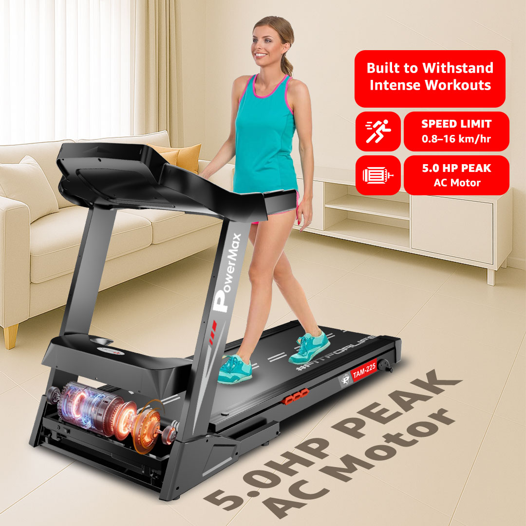 The PowerMax TAM-225 AC Motorized Treadmill is engineered for durability and comfort, powered by a robust 5.0 HP AC motor. It supports users up to 130KG and offers a spacious 1250 x 450 mm running surface. With MP3 connectivity, an iPad holder, and built-in speakers, it turns every workout into a motivating experience.