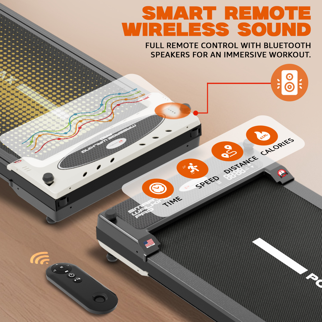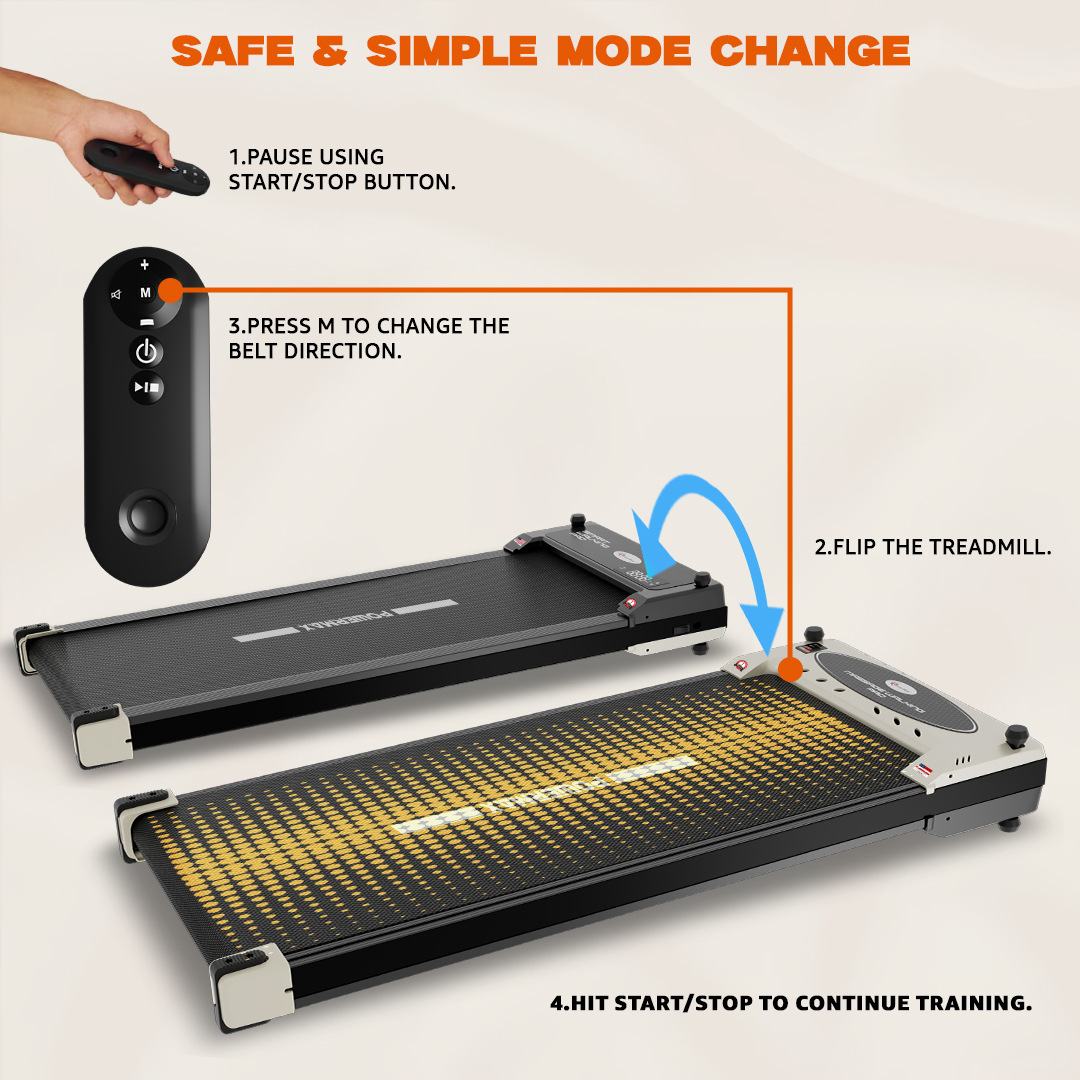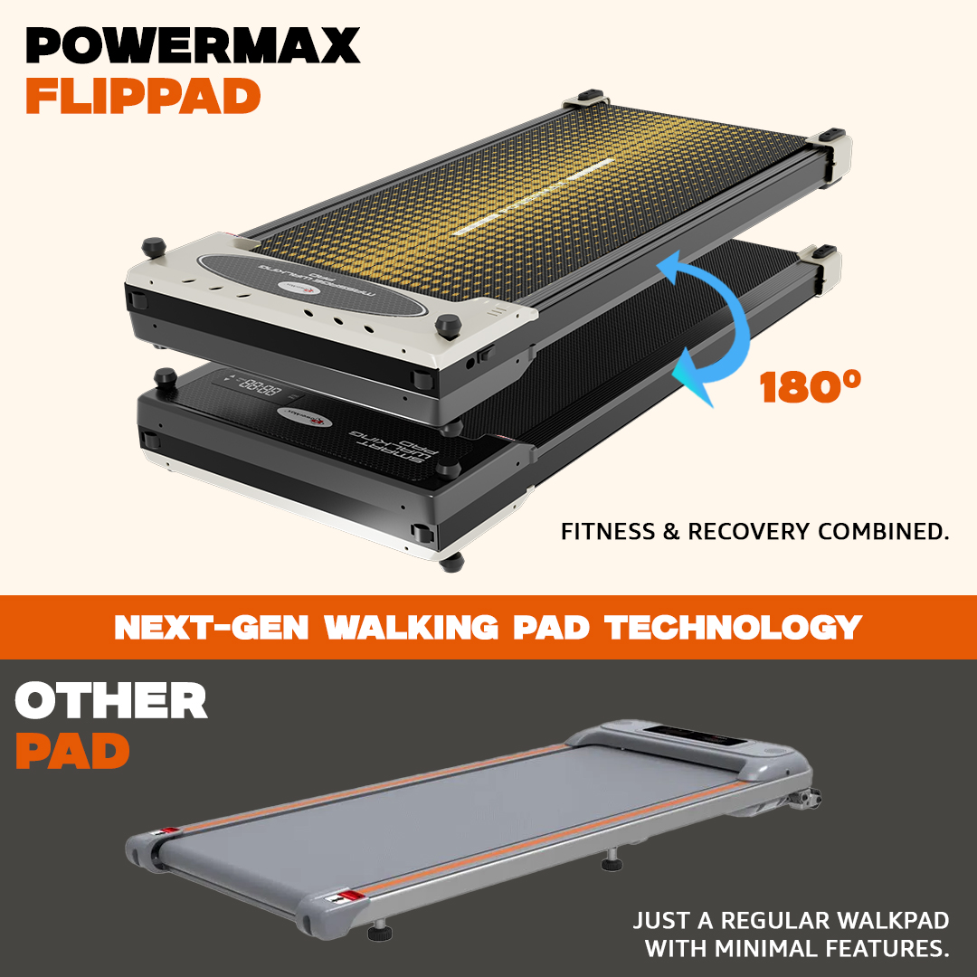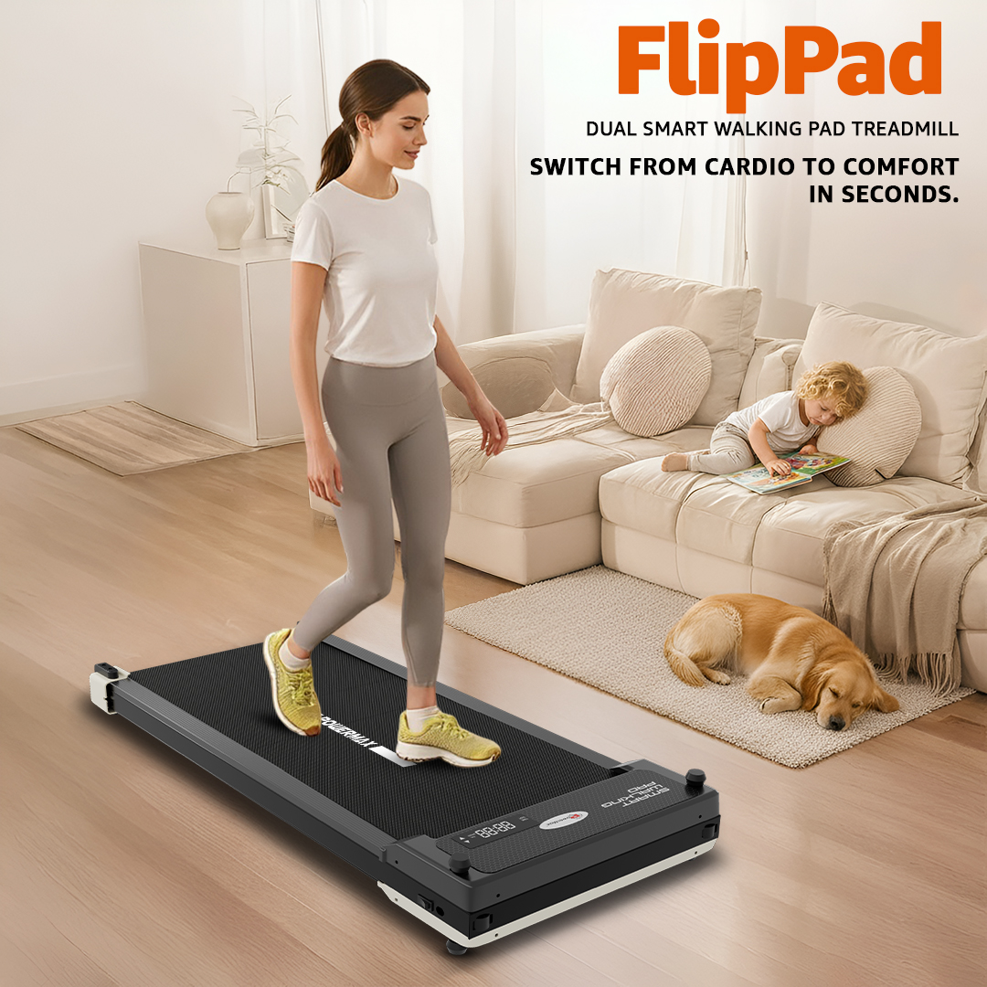 The roller configuration includes a 38 mm diameter and a length of 418 mm. Entertainment and connectivity features are included, as the treadmill supports Bluetooth functionality through the FlipPad app and enables MP3 playback. While no advanced app ecosystem is required, users can enjoy audio through the built-in speakers. A device holder allows phones or tablets to be positioned securely during exercise.