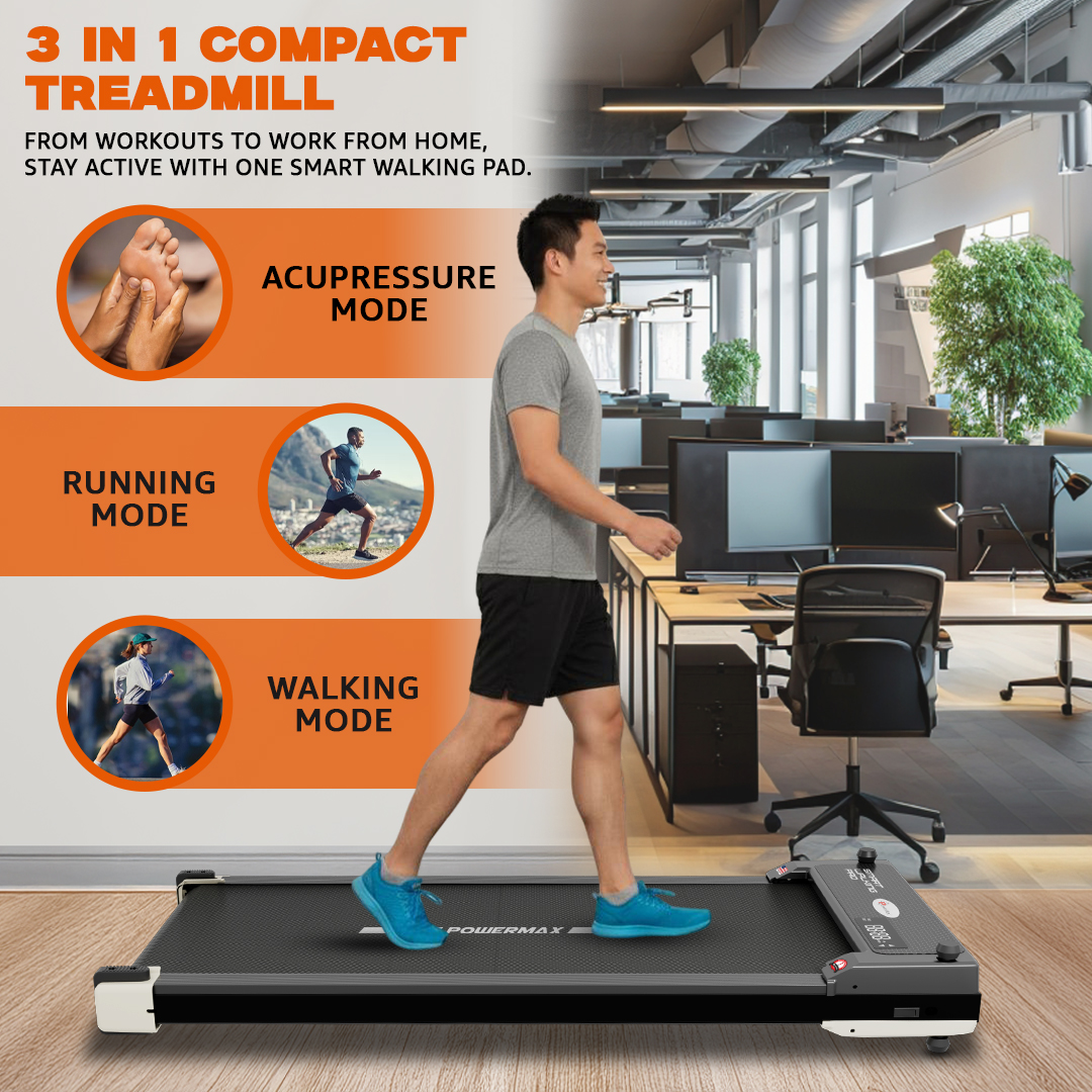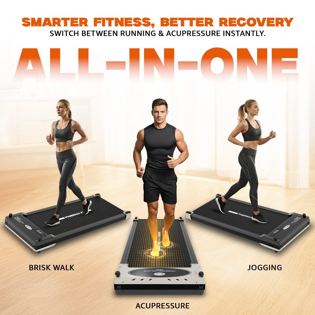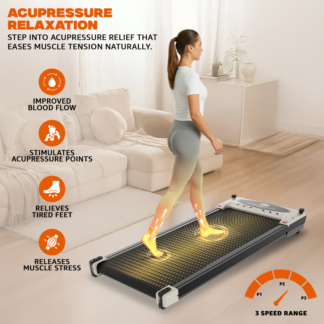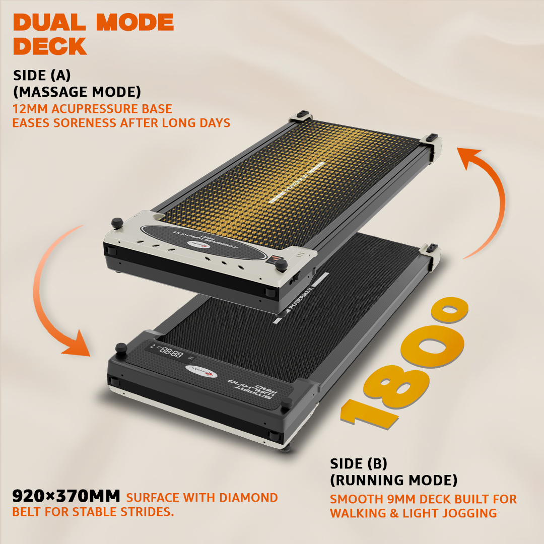 A compact LED display measuring 135 × 45 mm shows essential workout data including time, speed, distance, and calories. The treadmill does not include preset programs, BMI measurement, AUX input, or USB charging, keeping operation simple and minimalistic. A cooling fan is installed on the motor, and the treadmill can be operated through a remote control for convenience. In addition to its running functionality, the machine also includes a massage feature, offering multifunction use.