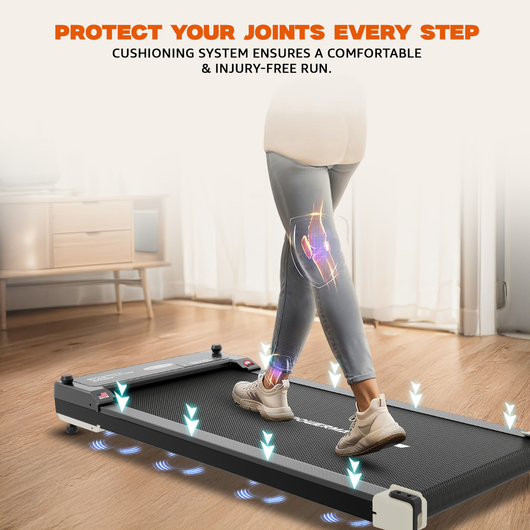 The treadmill runs on a flat, non-inclined design with no incline levels or adjustment required. Its running surface measures 920 × 370 mm with a diamond-textured belt for improved traction. The belt thickness is 1.4 mm, and the full running belt dimensions are 1930 × 370 mm. To enhance comfort, the structure uses a silicone shock-absorption system. The running deck itself measures 846 × 476.8 mm with a thickness of 12 mm, providing stability during use.