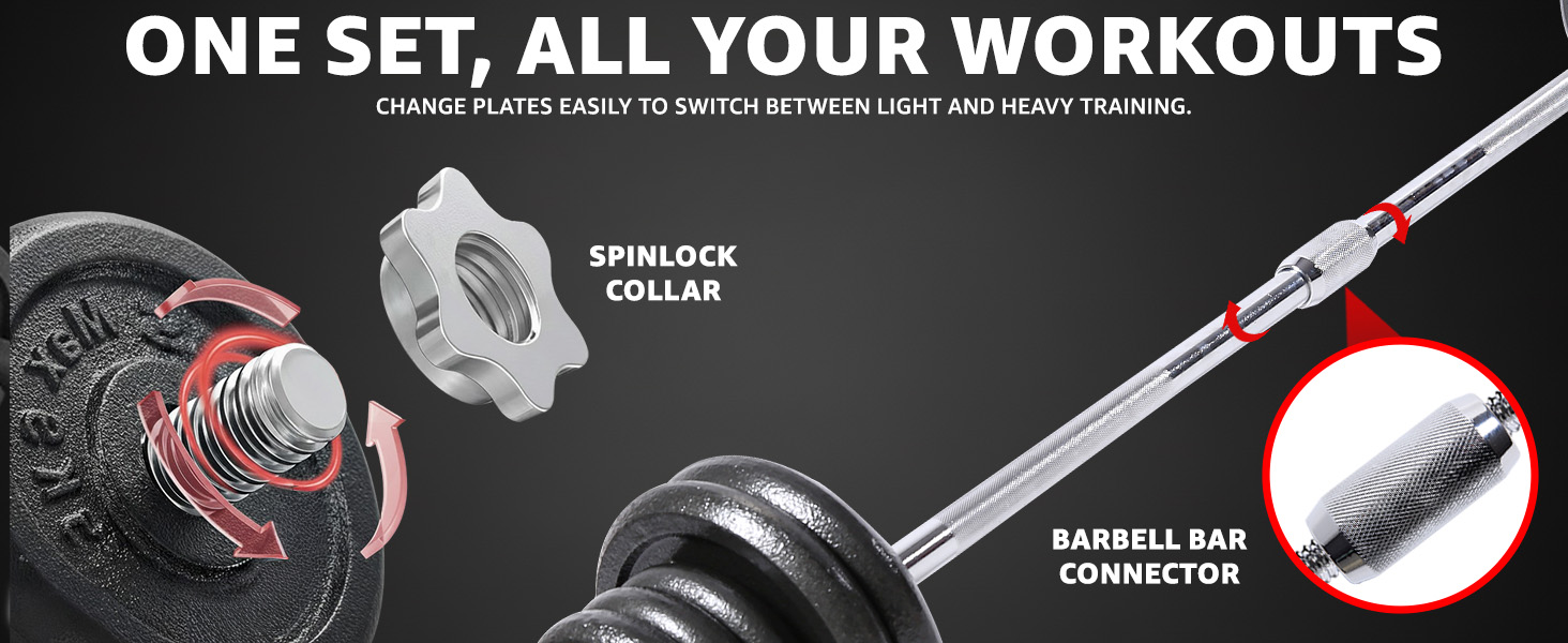 | Connecting Rods | 1 x 60inch Barbell Bar in 2 Sections, 2 x 14inch Chromed Bars, 1 x Barbell Connector |