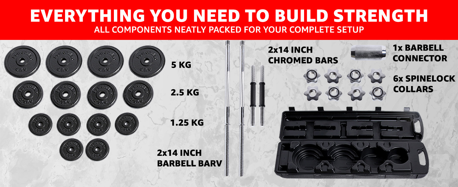 | Weight Plates | 4 x 5kg, 6 x 2.5kg, 4 x 1.25kg Solid Iron Plates |
