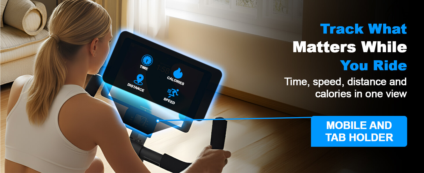A built-in holder accommodates both iPads and mobile phones, allowing you to stream workouts, follow training apps, or enjoy entertainment while you ride.