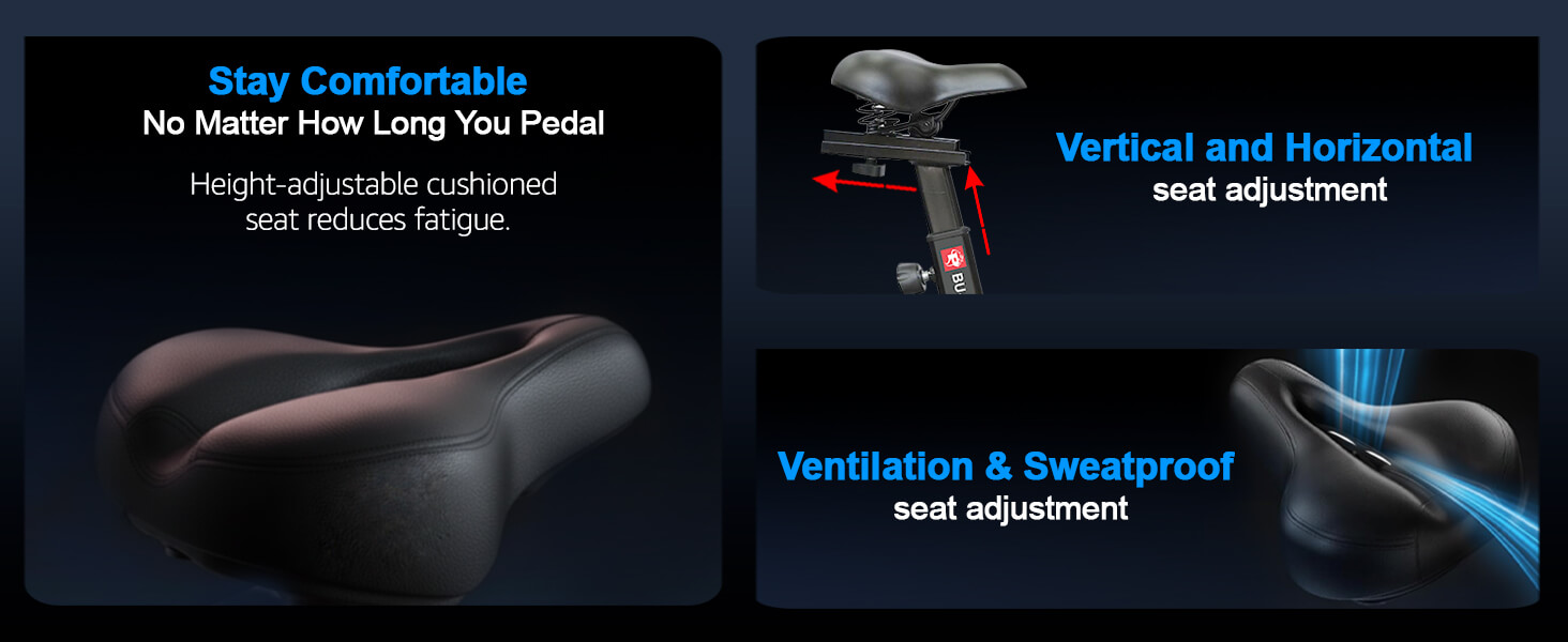 Comfort is a top priority with the vertically adjustable PU and foam seat, which allows users of different heights to find the perfect riding position. The supportive cushioning reduces fatigue, allowing for longer, more comfortable sessions.