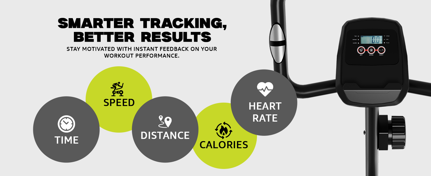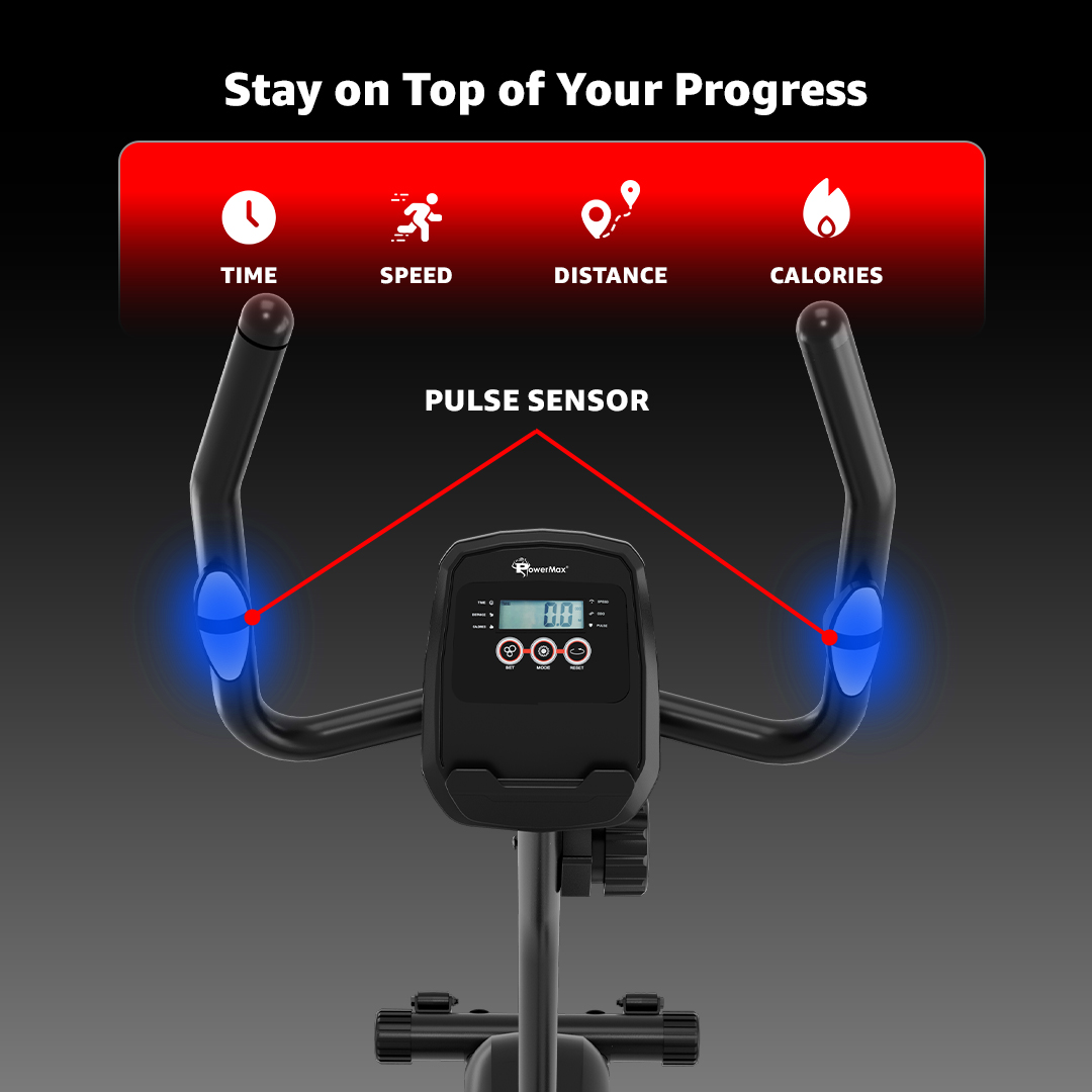PowerMax Fitness BU-400 Upright Bike features the LCD display shows Odometer, Time, Speed, Distance, Calories burned and Hand Pulse.