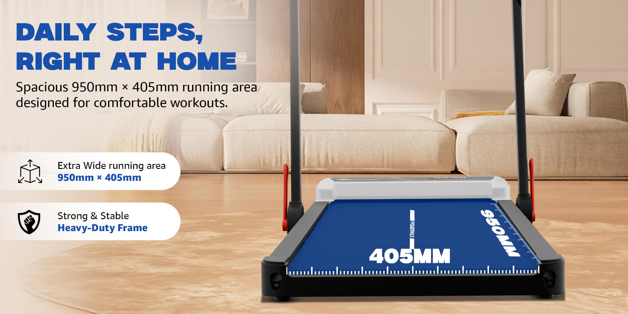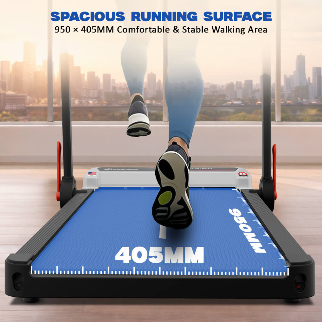 The treadmill features a 950 × 405 mm running surface, providing comfortable space for walking and jogging. Its diamond-textured anti-slip running belt ensures improved grip and safety during workouts, while shock-reducing pads under the running deck help reduce joint impact for a more comfortable training experience.