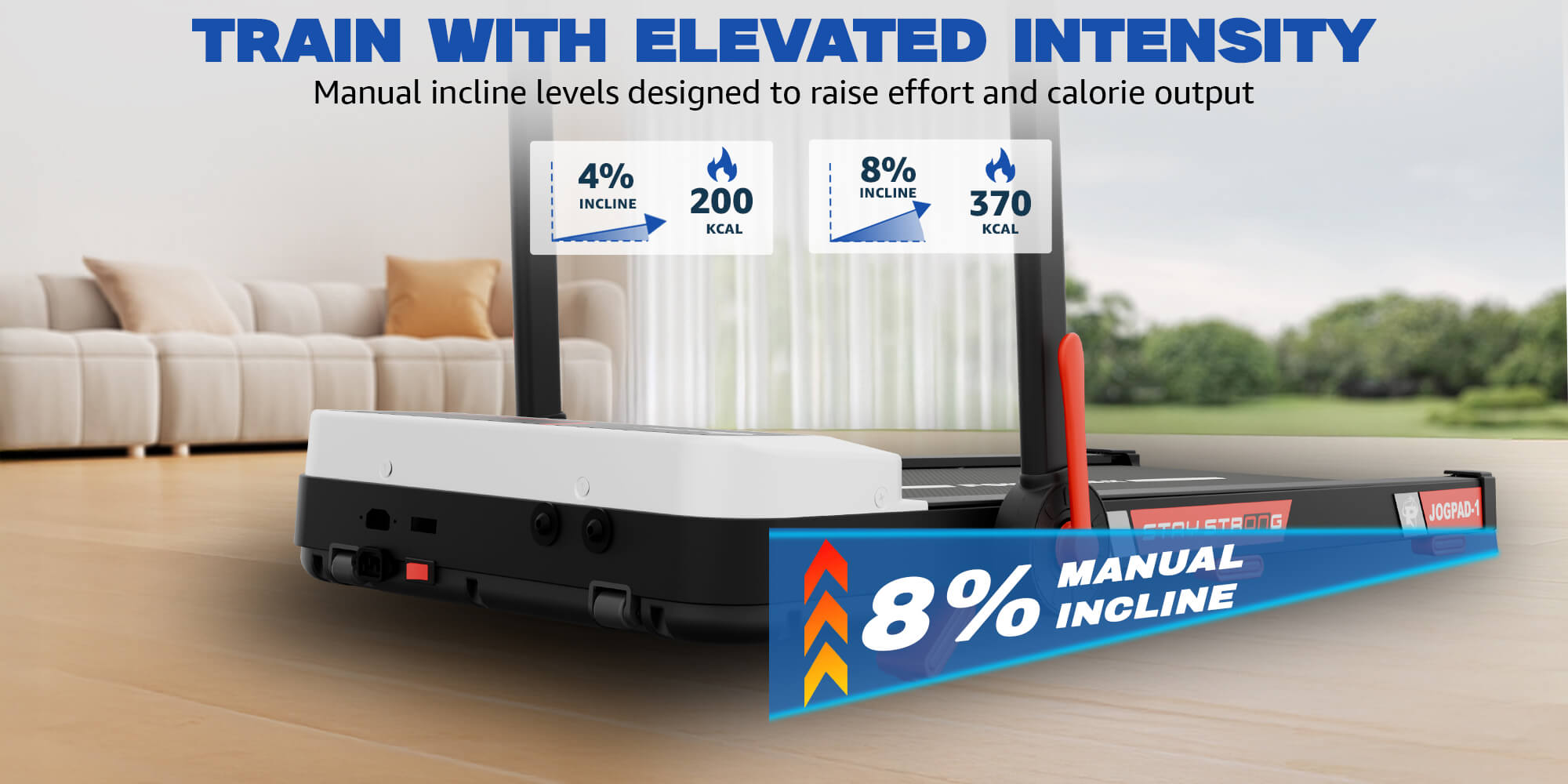 This home treadmill includes 2 levels of manual incline, helping users increase workout intensity and calorie burn. Incline workouts engage more muscle groups and improve overall endurance, making the JogPad-1 a practical cardio fitness machine for home gyms.