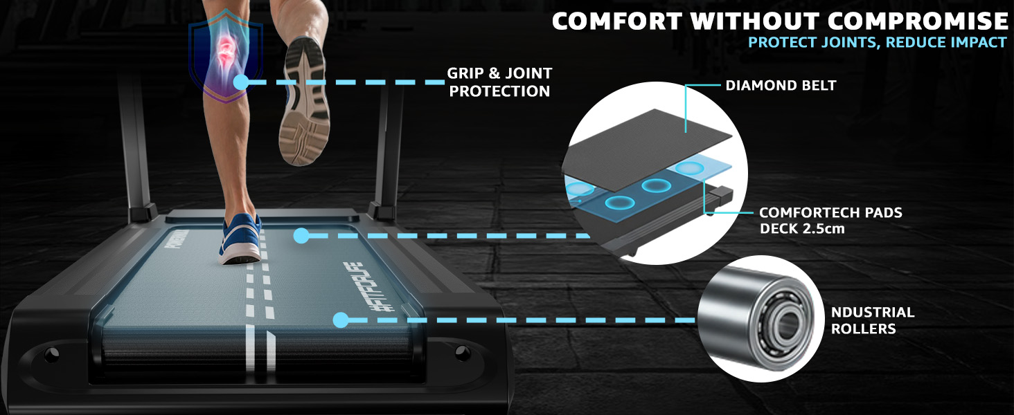 Finished with an anti-bacterial powder coat and supported by precision-machined rollers, this treadmill ensures long-lasting performance, low noise, and premium quality – perfect for gyms, studios, and serious home workouts.