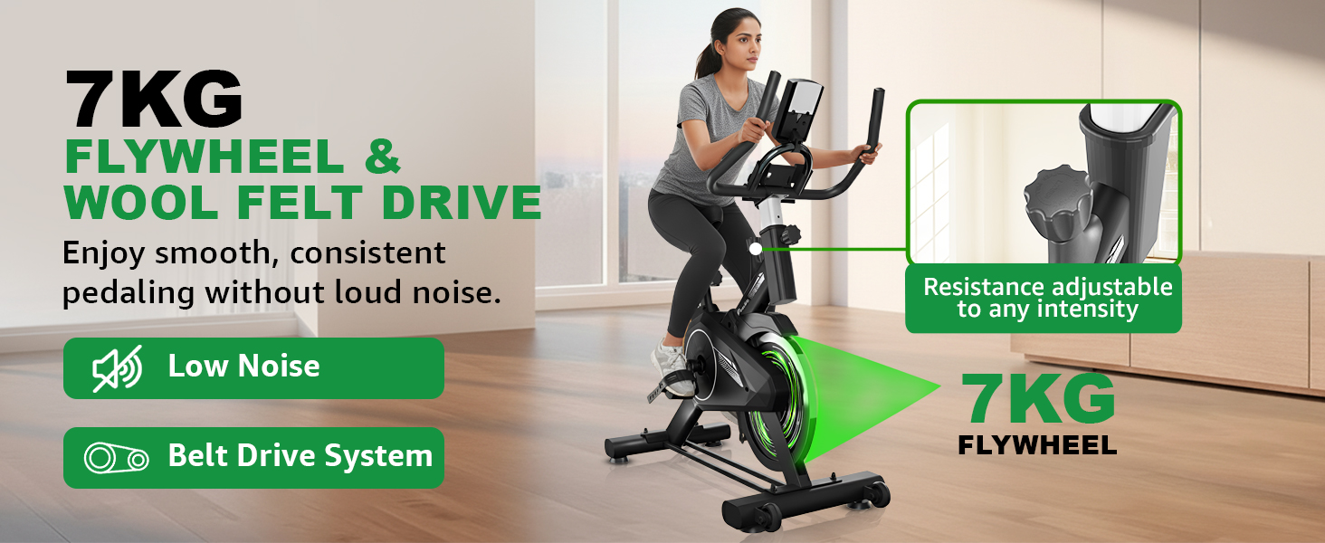 The 7KG precision-engineered flywheel ensures a smooth and natural riding experience. Combined with the 16mm flywheel thickness, this design minimizes vibrations and provides a stable and consistent motion, mimicking the feel of an outdoor cycling session.
