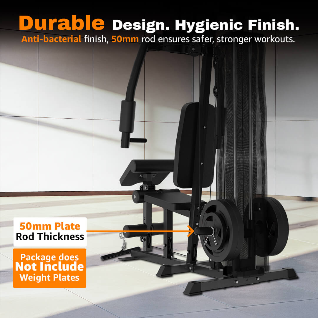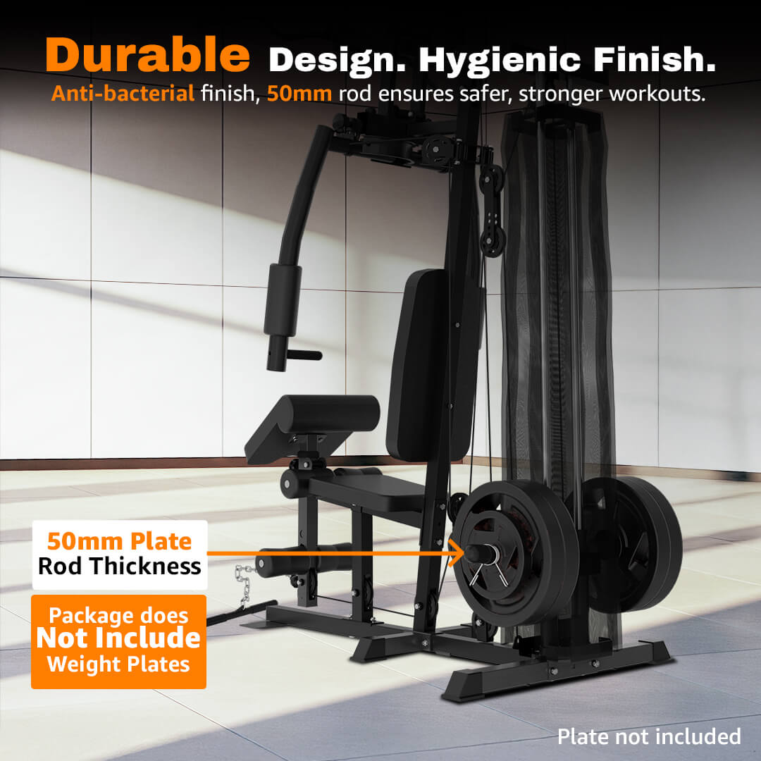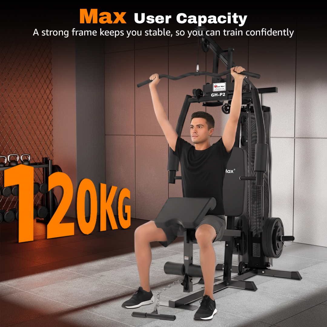 Crafted from 50x50mm and 50x70mm iron tubing with a 1.5mm wall thickness, the GH-P2 boasts excellent structural integrity. The robust weight machine can handle a maximum user weight of 120KG, making it ideal for all fitness levels. The weight stack includes plates weighing 58KG per box, filled with cement and encased in protective material for quieter operation and longer lifespan.