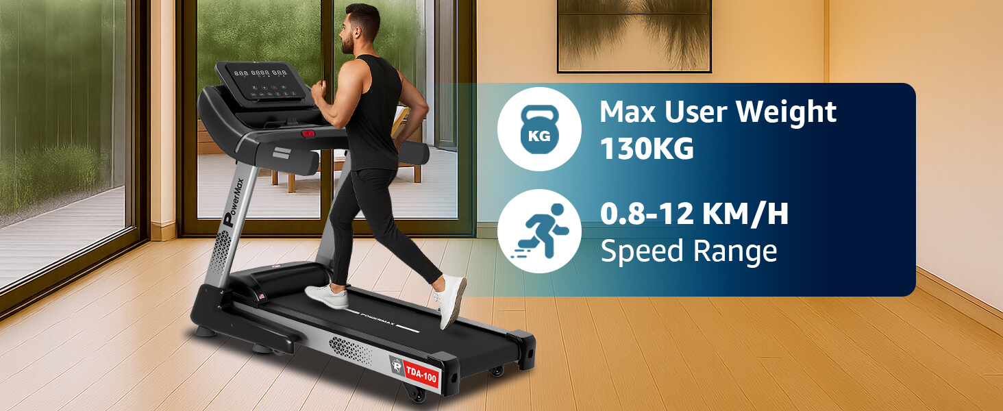 TDA 100 has a maximum user weight limit of 110kgs. If the user is 110 kgs or less he/she can use it for walking. For running, however, there needs to be a 25-30 kgs buffer. That is only if a user is weighing less than 85 kgs he/she can use it for running.